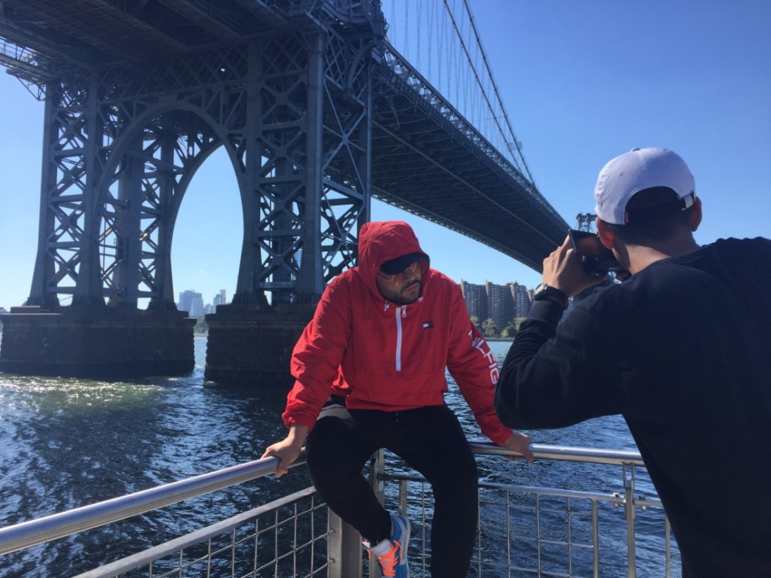 They have curated the photo shoot so that José and the gritty glam of Williamsburg can work in tandem. Manaure, who does most of the talking, says that they want the shoot to evoke a slice of “old New York.” As Manaure and José shoot in a few locations, starting at the cobblestones, then perched up against a rail overlooking the bridge, and finally on the bridge itself. It is there where José poses by graffiti and barbed wire, an image in particular which takes on a certain gravitas.